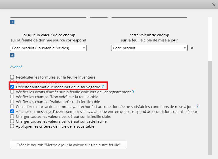 Recalculer les formules dans la feuille "Inventaire" : activez cette option si vous avez des champs contenant des formules qui font référence aux valeurs mises à jour par le bouton d'action "Mettre à jour les valeurs sur une autre feuille". Cela permettra de recalculer les formules après la mise à jour des valeurs.