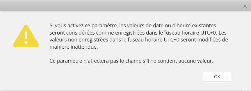 Lorsque vous cochez ou décochez l’option "Afficher selon le fuseau horaire du navigateur", le système affichera un message d’avertissement signalant que les valeurs du champ seront converties. Il est donc important de vérifier ce réglage et d’éviter de le modifier sur des champs contenant déjà des valeurs de date.