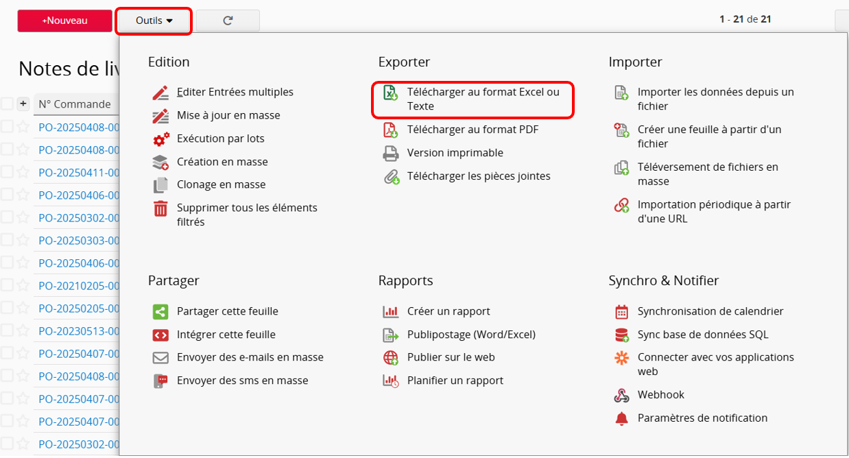 Si vous souhaitez télécharger la sauvegarde d'une feuille spécifique plutôt que l’ensemble de la base de données, cliquez sur Outils dans la page liste de la feuille concernée, sélectionnez Télécharger au format Excel ou Texte, puis sur l'onglet A partir d'une sauvegarde, et choisissez l'heure de sauvegarde voulue.