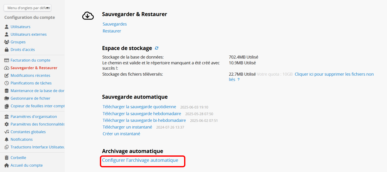 Si vous voulez restaurer une sauvegarde qui a été enregistrée comme un instantané, vous pouvez la télécharger et la restaurer manuellement lorsque cela est nécessaire.