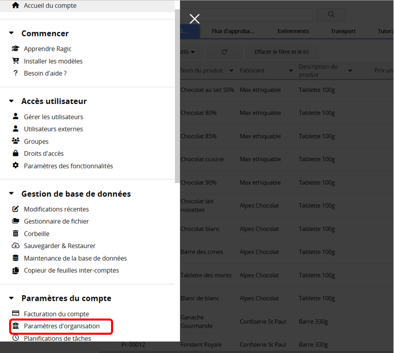 Cliquez sur l'icône à trois bandes horizontales située en haut à gauche de votre écran, puis sélectionnez Paramètres d'organisation en dessous de Paramètres du compte.