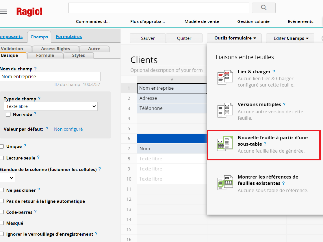 Vous verrez alors une liste des sous-tables qui se trouvent sur ce formulaire. En cliquant sur le lien Créer une nouvelle feuille, vous créerez un nouveau formulaire avec les champs de la sous-table correspondante.