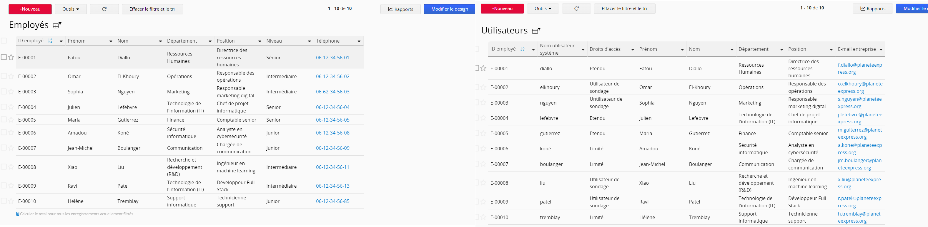 Si vous souhaitez que différents utilisateurs voient des versions différentes du même enregistrement, vous pouvez utiliser des feuilles à versions multiples. Par exemple, une "Fiche d’informations du personnel" et un "Annuaire des employés" peuvent partager certaines informations, comme les noms, les postes et les coordonnées, habituellement consultables par tous les membres d'une entreprise. Cependant, la « fiche d’informations du personnel » inclut également des informations sensibles, telles que les adresses, âges et expériences professionnelles, qui ne doivent pas être accessibles à tous les employés.
