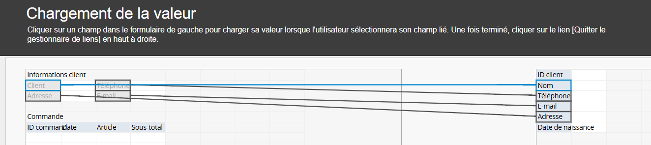 Pour modifier le champ lié, cliquez simplement sur le champ "Nom du client" en maintenant le bouton gauche de la souris enfoncé, faites-le glisser vers le champ "ID client", puis relâchez le bouton pour valider la modification.