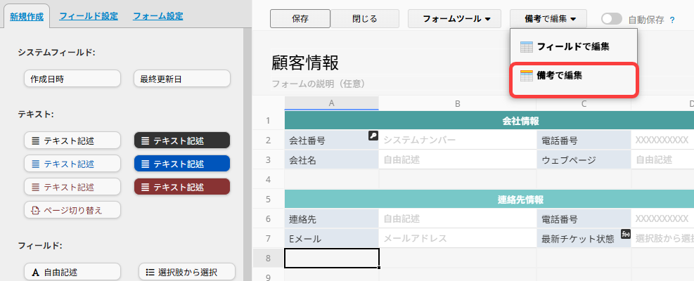 シートにマークや装飾的なテキストフィールドを作成出来ます。デザインモードで入力する場合、データを格納するためのフィールドがデフォルトで作成されます。上の編集フィールドのボタンをクリック後、備考で編集をクリックすると、編集モードを変更することができます。