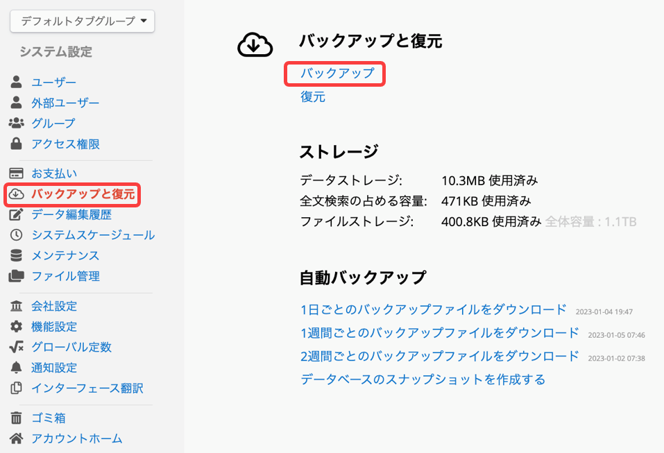 バックアップファイルをダウンロードした後、バックアップと復元のページでバックアップファイルを アップロードして復元することも可能。復元されるバックアップファイルは、データベース全体を直接上書きしますので、正しいバージョンのバックアップを復元することを確認してください。