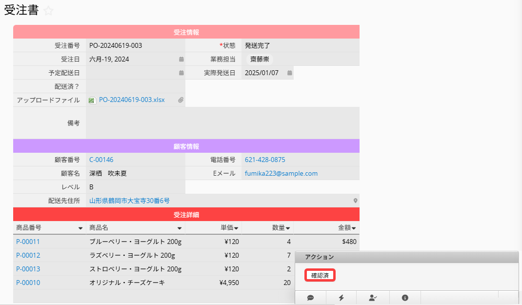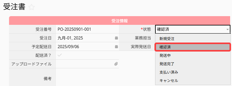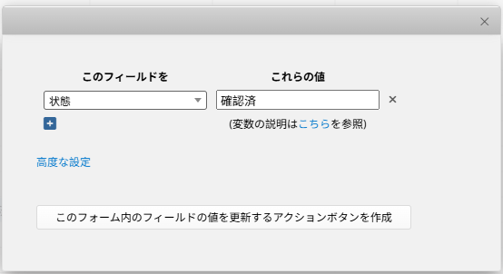 ワークフローの中で、「注文状況」フィールドの修正など、重複する作業がある場合。最もよく選択されるオプションが「完成」である場合、このフォーム内のフィールド値を更新ボタンを使って、フィールドを「完成」に更新することができます。このボタンを使うことで、ダブルクリックでデータ編集モードに入り、たくさんのフィールドの中から「注文状況」フィールドを探し、希望の値に変更する手間を省くことができます。