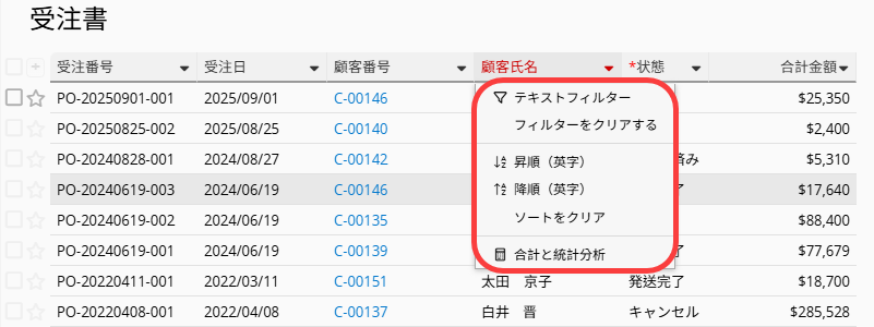 リストページのフィールドヘッダー横にある矢印をクリックすると、データのフィルタリングやソートができます。