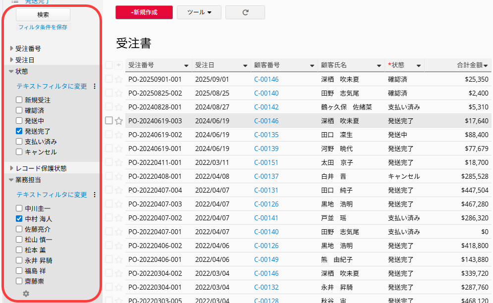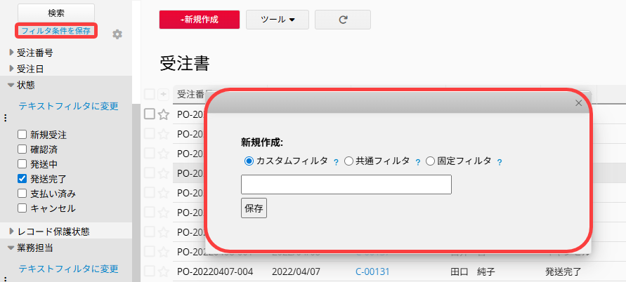 また、よく使うフィルターを保存しておき、次回に利用することも可能です。 カスタムフィルタ、共通フィルタ、固定フィルタの3種類のフィルターに対応しています。
