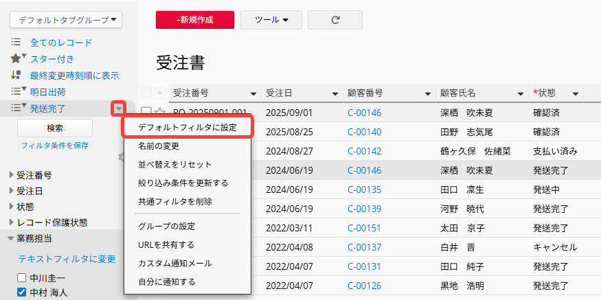 保存された共通フィルタに右クリックをさらにデフォルトフィルタとして設定し、ユーザーがこのシートを閲覧する際に自動的にこのフィルタが適用されます。