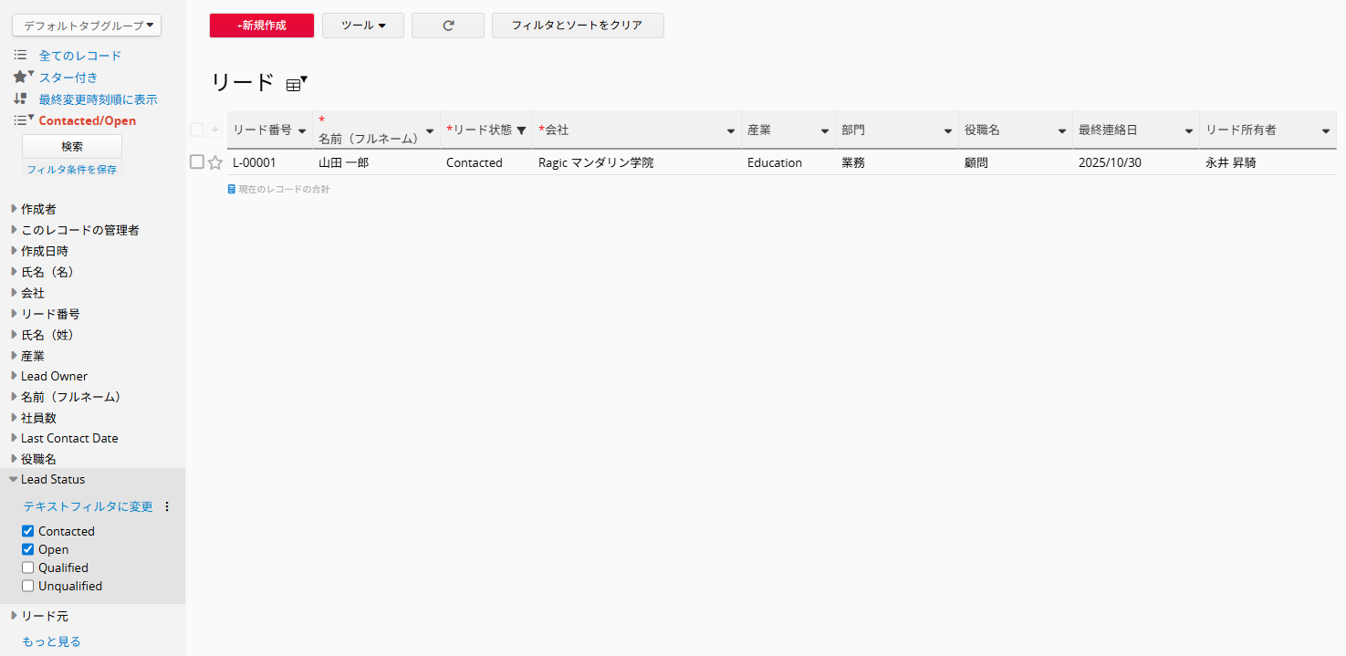 既定では、デフォルトフィルターが適用され、「ステータス=Open」のリードのみが一覧ページに表示されます。