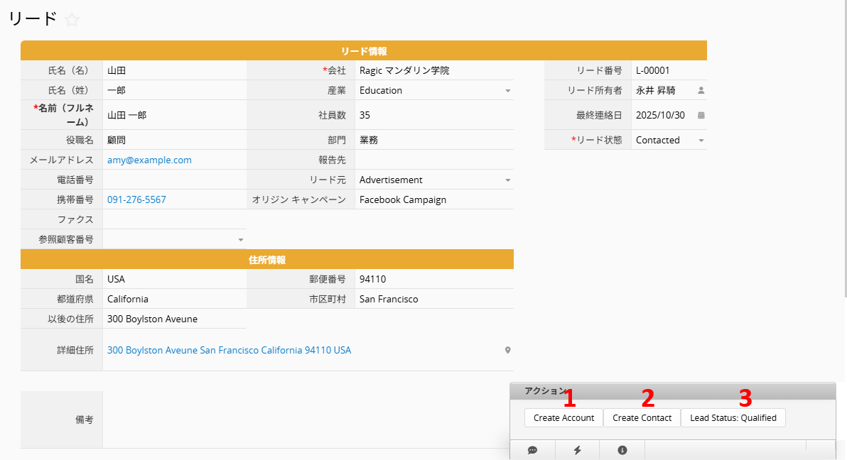 その後、(2)「連絡担当作成(Create Contact)」アクションボタンをクリックすると、Leads から 「連絡先(Contact)」 シートのレコードを作成できます。