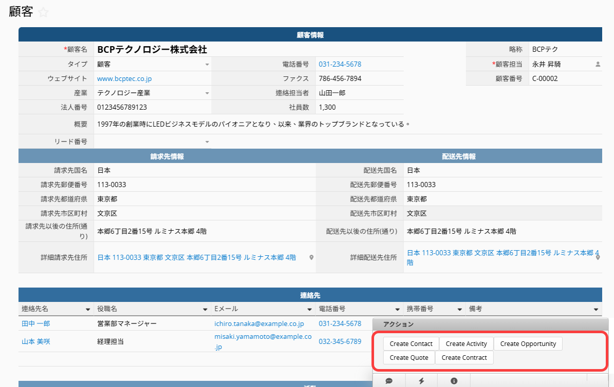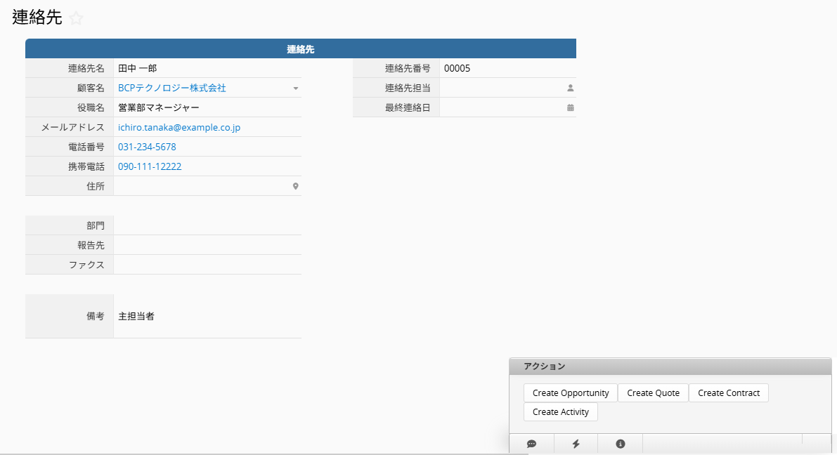 各元シート上では、本「顧客」と紐付いた新規レコード(連絡先 / 活動 / 機会 / 見積書 / 契約)を、フォームページ右下にある各シート名が表示されたアクションボタン(雷のアイコン)より作成できます。