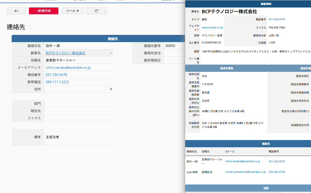 「関連項目」 セクションで入力した情報(関連する取引先企業など)は、該当企業の「顧客」シート内「活動」子テーブルにも表示されます。