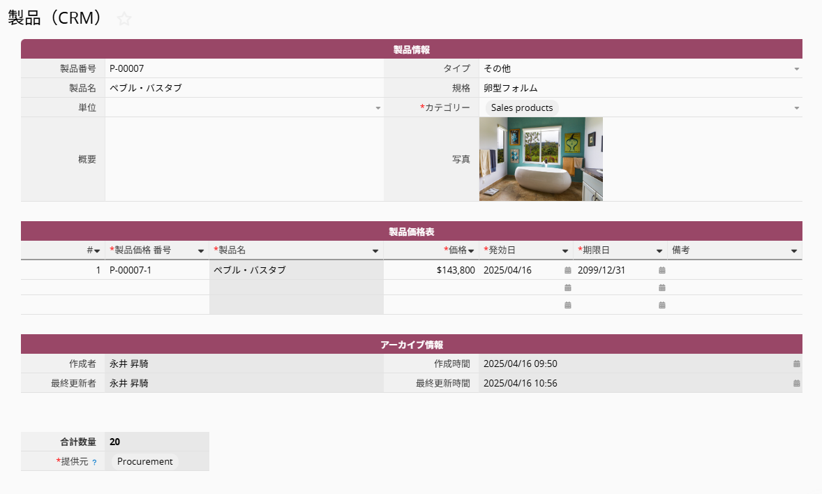 このシートは、製品 (CRM) シート内の「製品価格表」子テーブルから生成 されています。