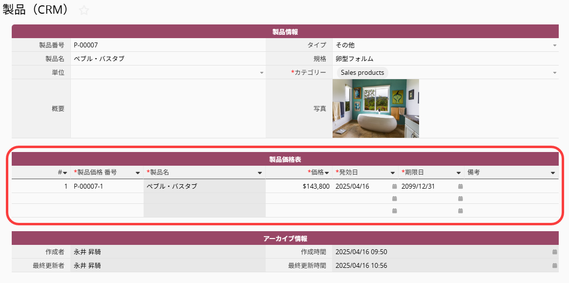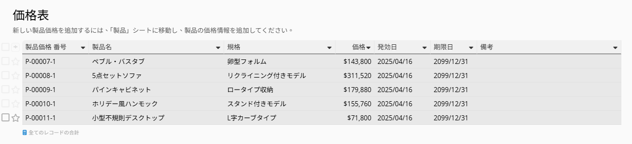 シート内の「製品価格表」子テーブルでは、商品に対して複数の単価情報を記録することができます。