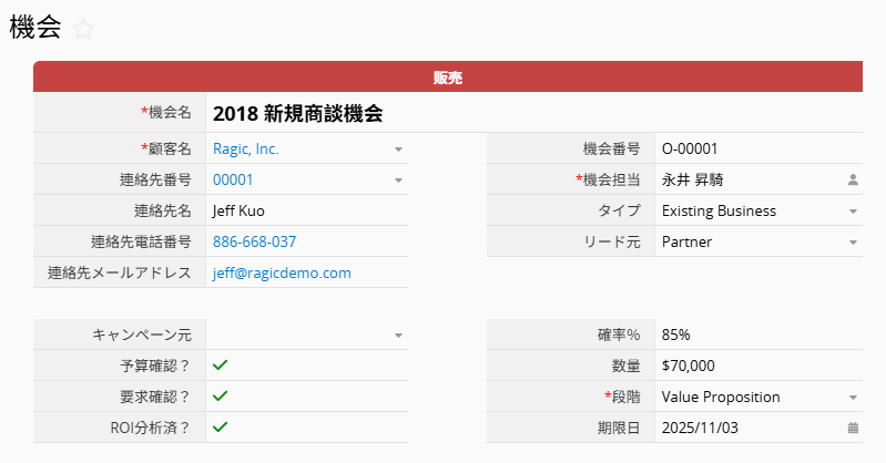 このシートでは、商談情報を記録します。「機会名」「顧客名」「機会担当」「段階」フィールドは必須項目 として設定されています。