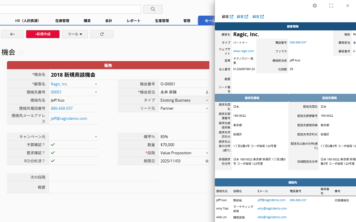 「顧客名」(関連企業)を選択すると、当該商談情報は顧客シート内の「機会」子テーブルにも表示されます。