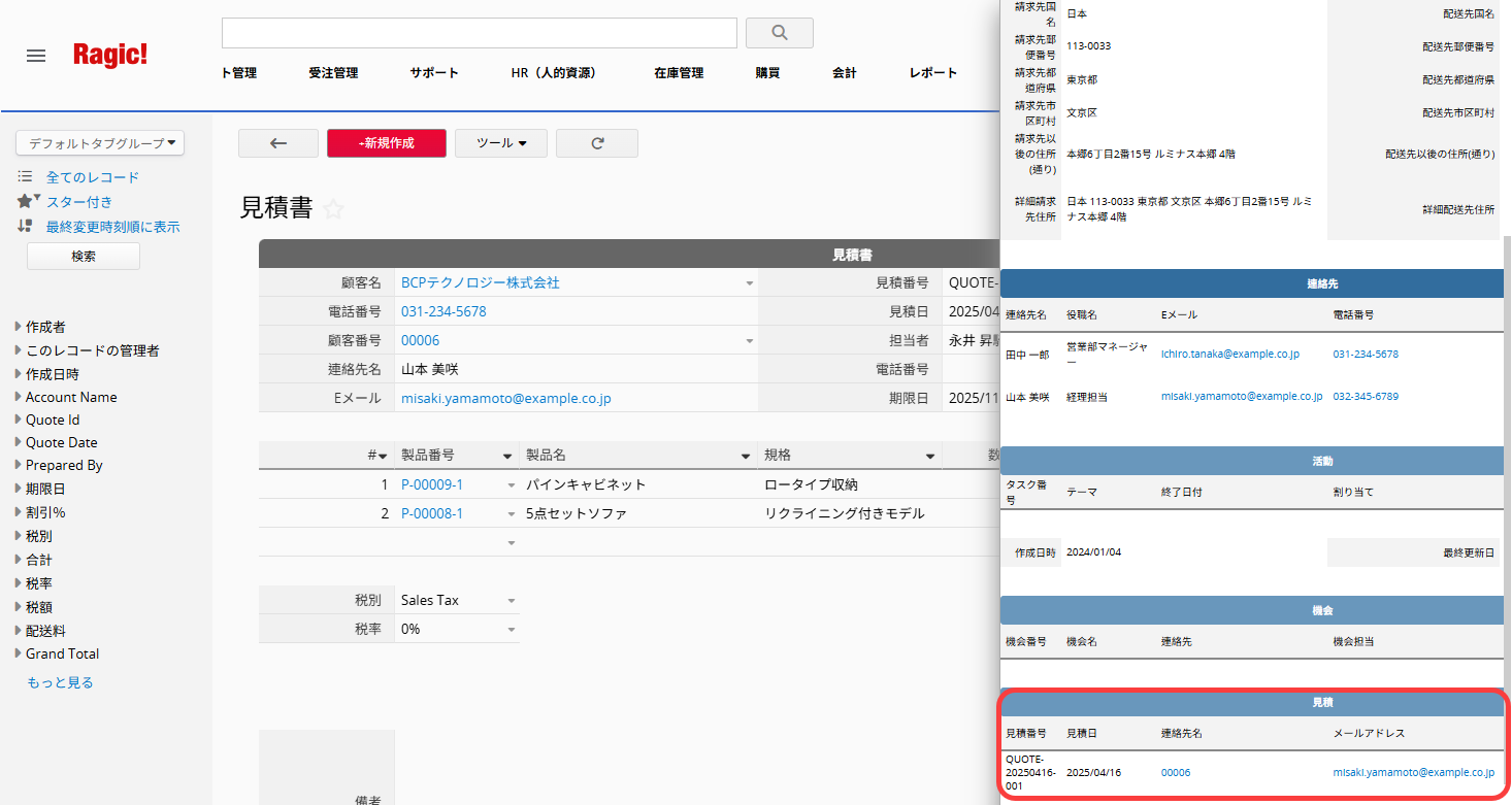 「顧客名」を入力すると、その見積りレコードは該当企業の 顧客 シート内「見積書」子テーブルにも自動表示されます。