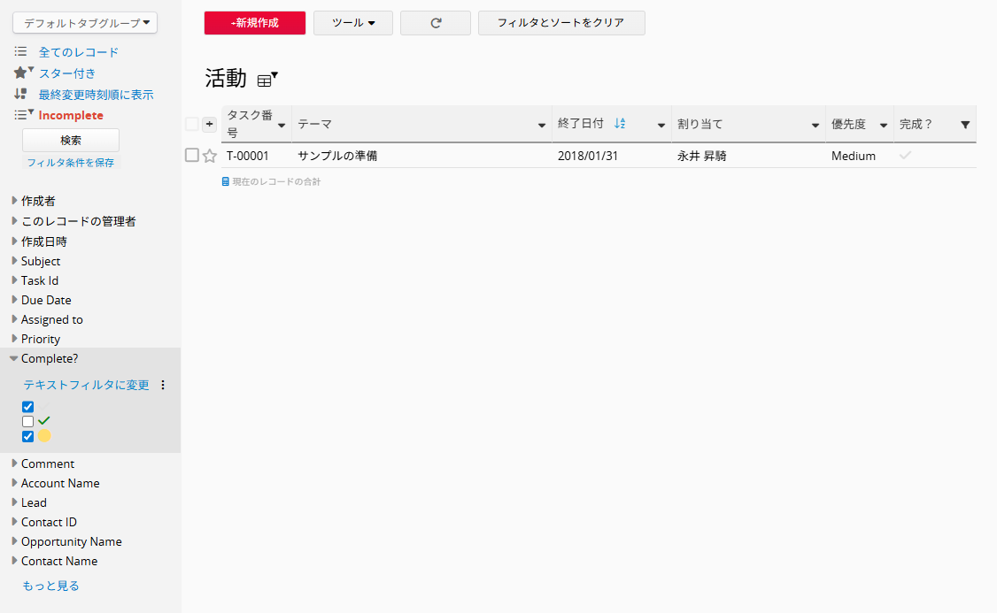 「活動」シートでは、デフォルトフィルタ により、未完了(Incomplete)の活動のみが表示されます。
