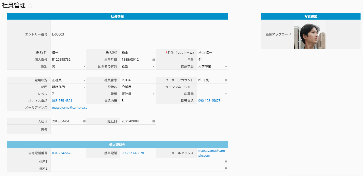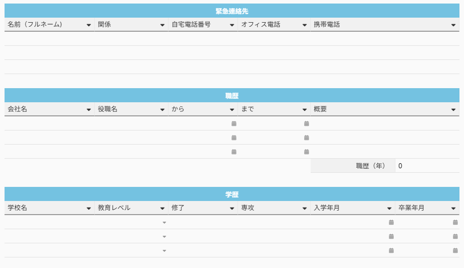 子テーブル(緊急連絡先、職務経歴、学歴の子テーブル)では、社員データと 一対多 の関係を構築できます。例えば、1 名の社員に対して複数の勤務先や学校を記録することが可能です。