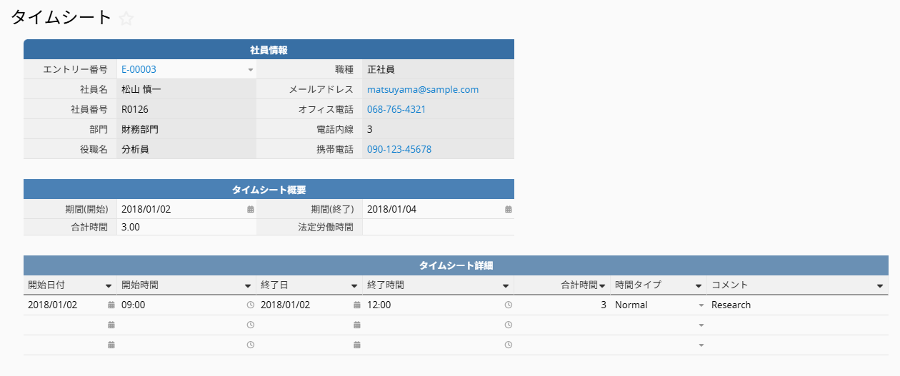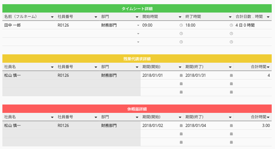 また、下部の子テーブルでは、社員の勤務時間の詳細を入力できます。