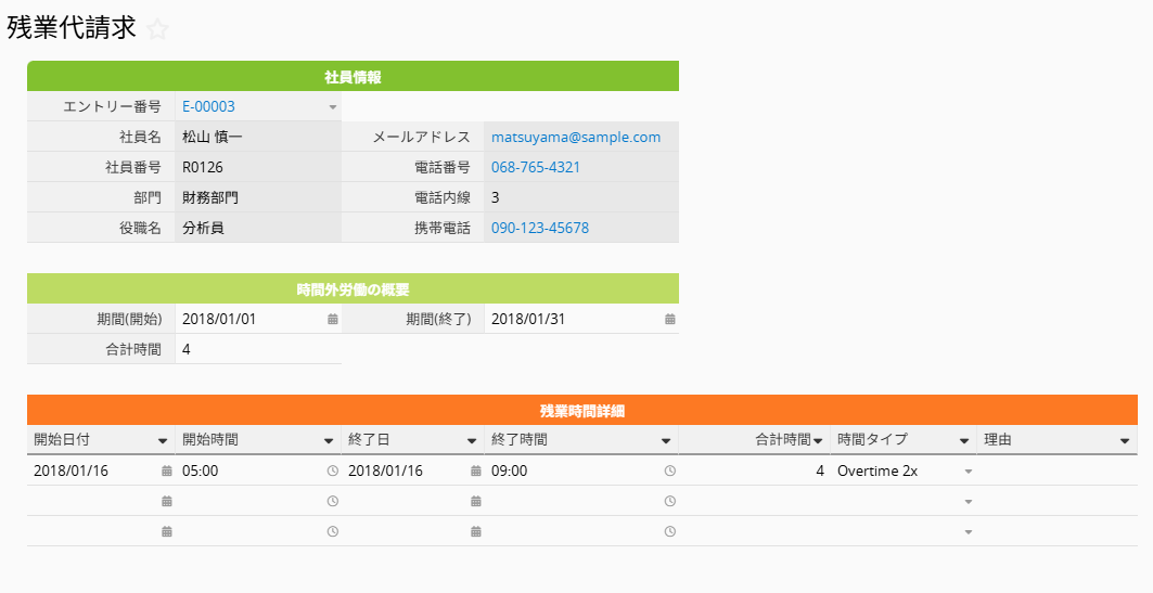 各社員の 社員管理 エントリ内で、タイムシート、残業、休暇の情報をまとめて確認したい場合は、参照子テーブル を作成することで実現できます。