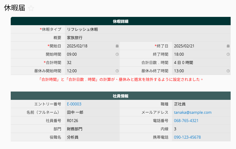 合計時間フィールドは、休暇日(および時間)の入力に基づき、数式によって自動計算されます。この際、昼休みや週末は自動的に除外されます。