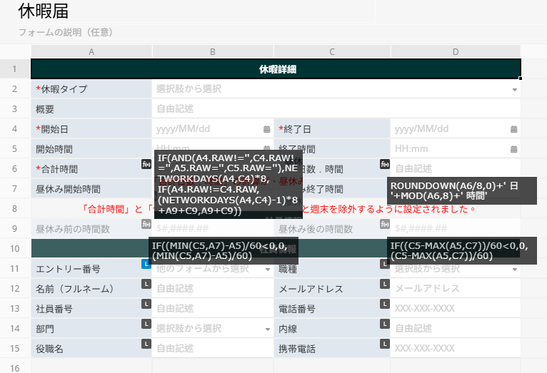 また、自分で休暇届シートを設計したいものの、どのように数式を書けばよいか分からない場合は、下記の画像を参考にしてください。