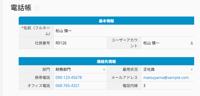 「電話帳」は 総務 カテゴリにあるテンプレートですが、実際には マルチシート により作成された 社員管理シートの別バージョン です。つまり、用途に応じて複数のビューが設定されており、すべて同じデータソースを共有し相互にリンクされています。「社員管理」シートは人事部が利用するため、詳細な個人情報を表示します。一方、「電話帳」は社員同士が連絡を取るためのビューとして設計されており、基本的な連絡先情報のみを表示し、その他のフィールドは非表示になっています。また、マルチシートごとに異なる アクセス権限 を設定することも可能です。