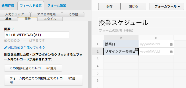 2. 「リマインダー参照日」フィールドに WEEKDAY 関数 を使用し、「授業日」フィールドを基準に次の日曜日の日付を計算します。