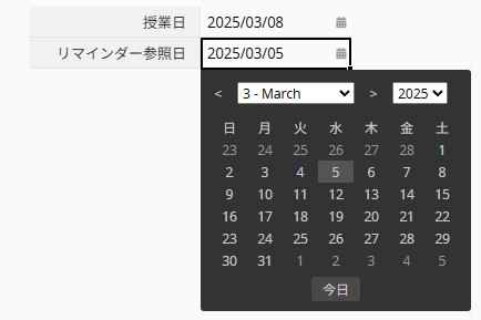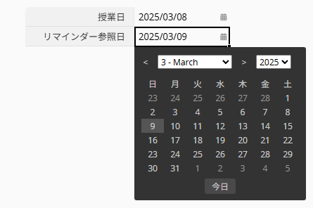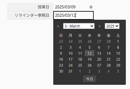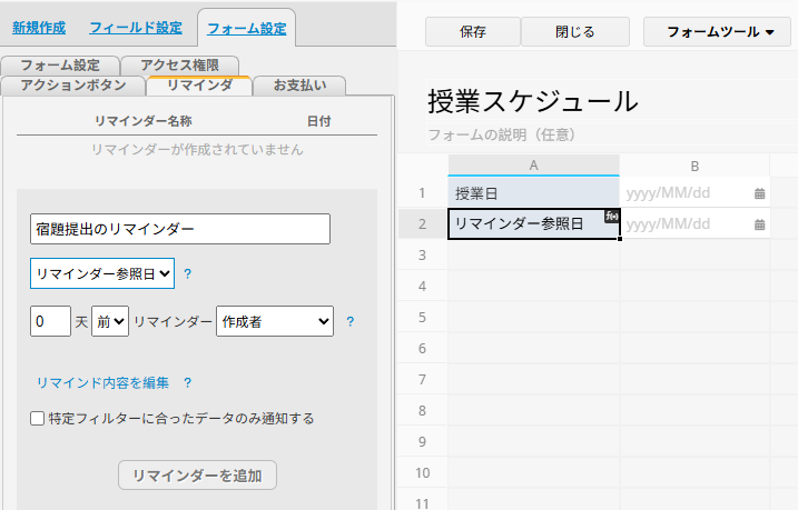 1. 「授業日」フィールド(A1)に加えて、新しく日付フィールドを作成し、「リマインダー参照日」として設定します。