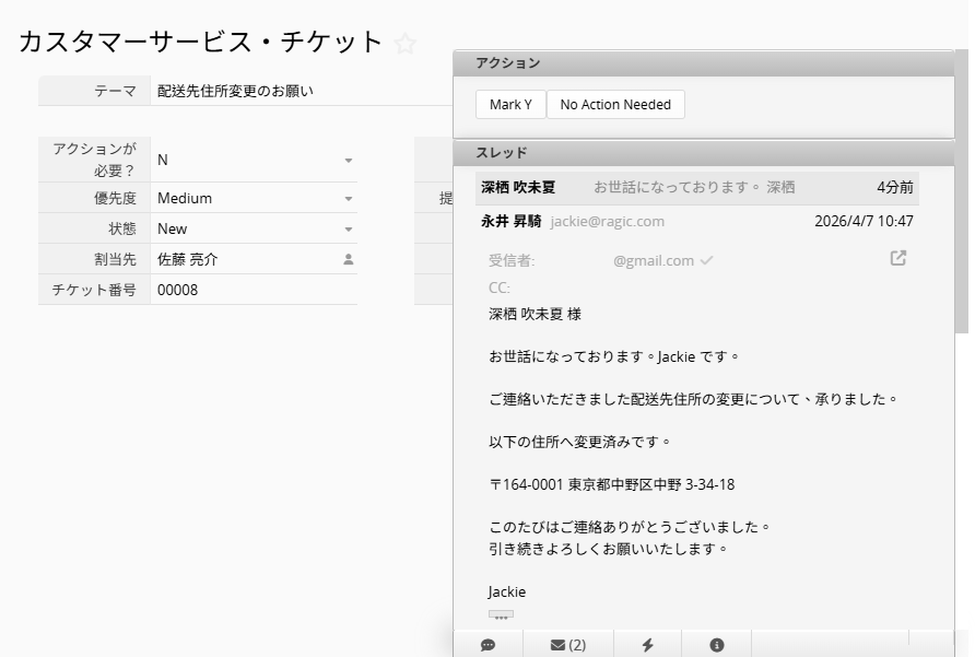 メールサポートチケットシステムテンプレート では、受信したメールをRagic内で管理することができますが、「apname.tab_path.sheet_index@tickets.ragic.com」をメール受信者に設定することで、受信したメールからエントリーを作成し、Ragicのデータベースに保存することができます。