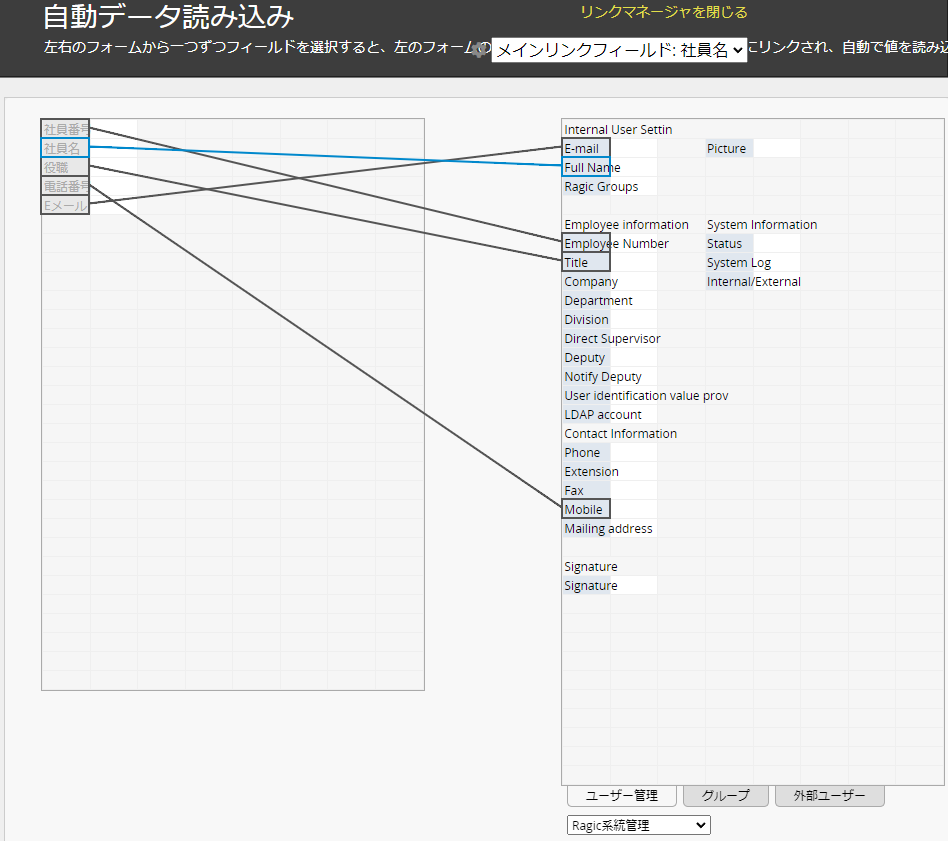 3. フォームツール > リンクと読み込み でリンクマネージャーを開きます。右下のドロップダウンメニューからRagic システム管理を選択し、ユーザー管理タブを選択します: