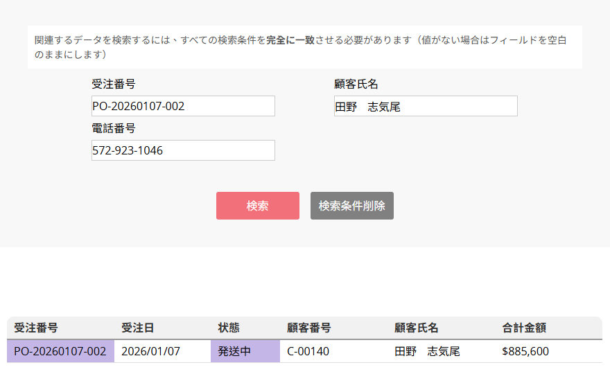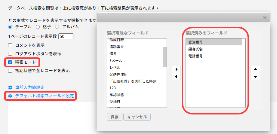 2. 精密モード の設定は同一シート内で共有されます。たとえば「受注書」シートの データベース内検索 で 精密モード を有効にすると、同じシートの データベース内検索&閲覧 にも適用されます。どちらか一方で無効にすると、両方から設定が解除されます。