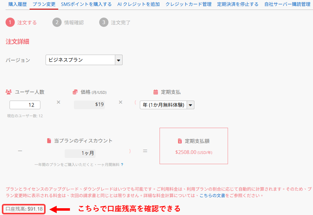 ユーザー数やプランはいつでも変更可能で、変更内容は即時反映され、差額はその場で精算されます。プランのダウングレードやユーザー数の削減を行った場合、その差額はアカウント残高に充当されます。