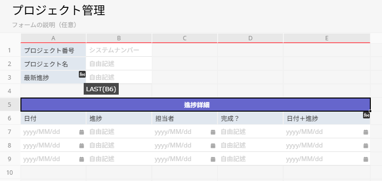 たとえばプロジェクト管理などで、最新の進捗情報をリストページに表示したい場合は、独立フィールドを追加し、子テーブル内の最新行の値を返すLAST()関数を使うことで実現できます。