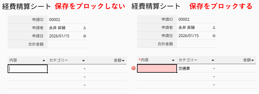 子テーブル フィールドを 必須 に設定した場合、システムがチェックを行うのは「子テーブルの行が追加されたときのみ」です。 そのため、シート内に少なくとも 1 行の子テーブル行が必須になるわけではありません。 結果として、子テーブルに行が 1 行も追加されていない状態でも、シート自体は保存可能となります。