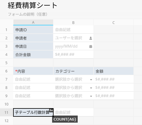 独立フィールド(例:「子テーブル行数」)を作成し、COUNTA() 関数を使用して子テーブルの行数を算出します。例:COUNTA(A6)。