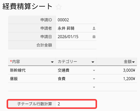 このフィールドは、現在の子テーブル行数を自動的に返します。