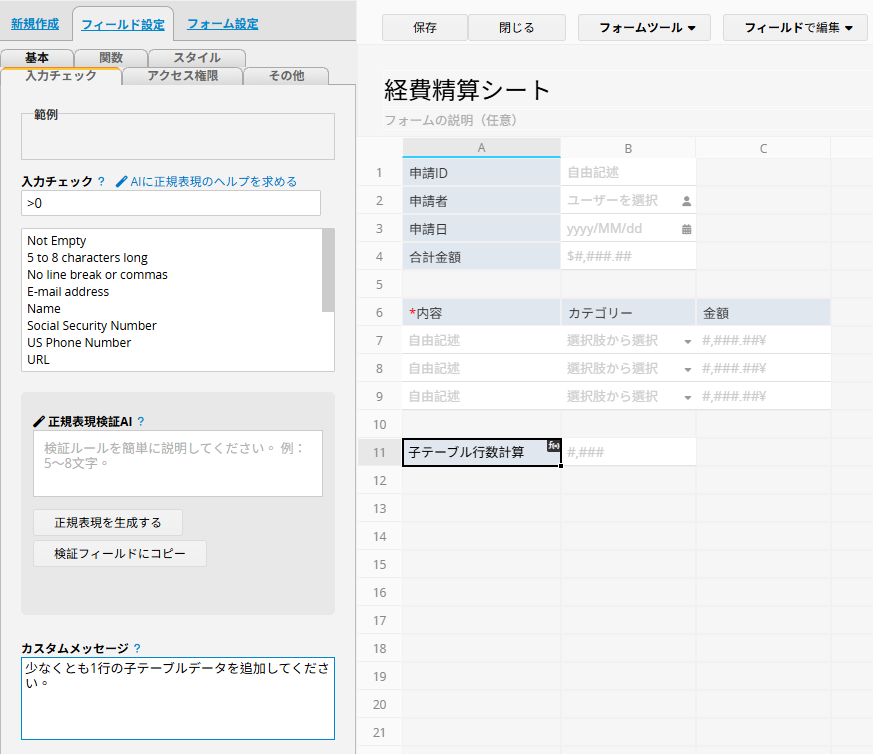 「子テーブル行数」フィールドに 入力チェック を設定し、保存条件として値が 0 より大きい ことを必須にします。 また、ユーザーに表示するメッセージもカスタマイズできます。