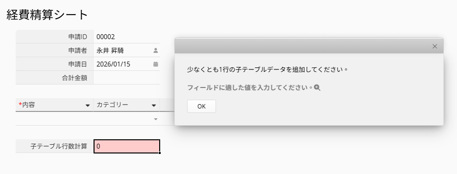 これらの設定を完了すると、子テーブルに行を 1 行も追加せずにシートを保存しようとした場合、行数が 0 のため保存できず、設定した入力チェックメッセージが表示されます。