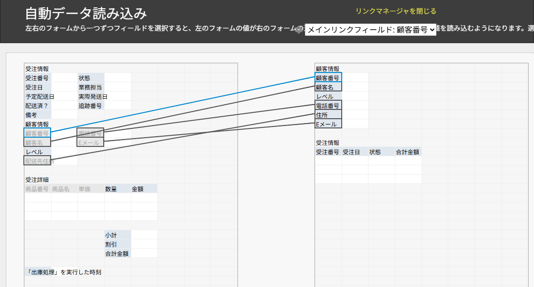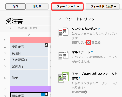 例えば、「注文」シートで「顧客 ID」フィールドを「顧客」シートの「顧客 ID」フィールドとリンクと読み込みで設定した場合、「注文」シート内の「顧客名」「顧客電話番号」「顧客住所」などのフィールドは、「顧客」シートの対応するフィールドから自動的にデータを読み込みます。