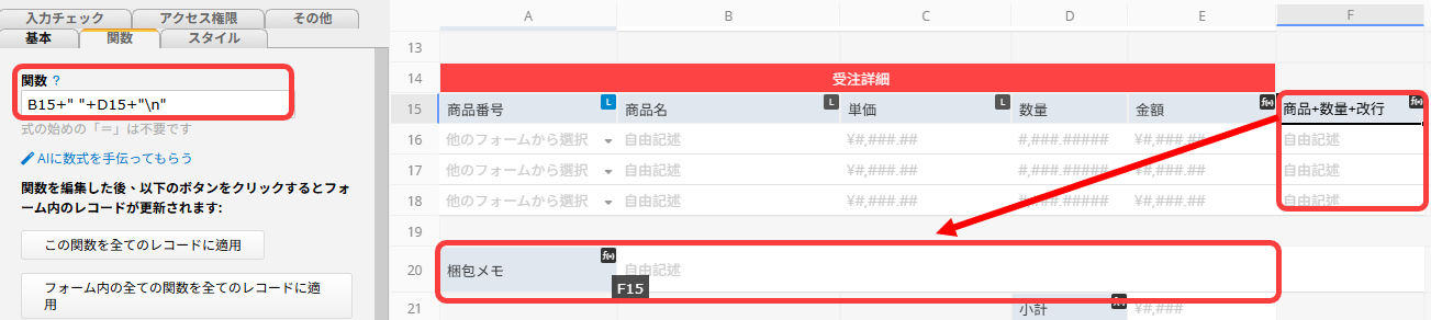 2. 対象フィールドの値を「\n」の改行文字で結合する計算式を設定します。