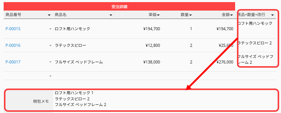 特定の子テーブル内の各行データを、別のフィールドに改行付きで表示したい場合は、以下の手順で設定してください。