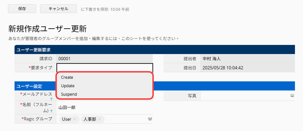このシートでは、自分が管理するグループに所属するユーザーの作成・更新・一時停止(SUSPENDED)が可能です。
