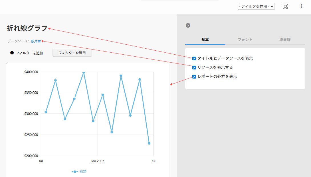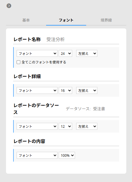 レポート設定には、基本、フォント、境界線 の 3 つのセクションがあります。