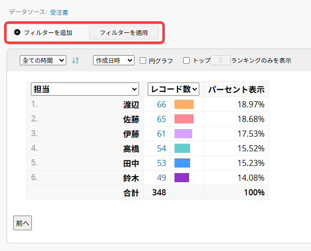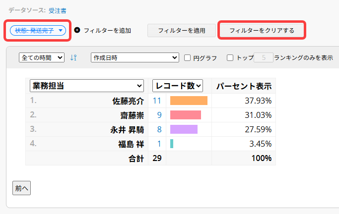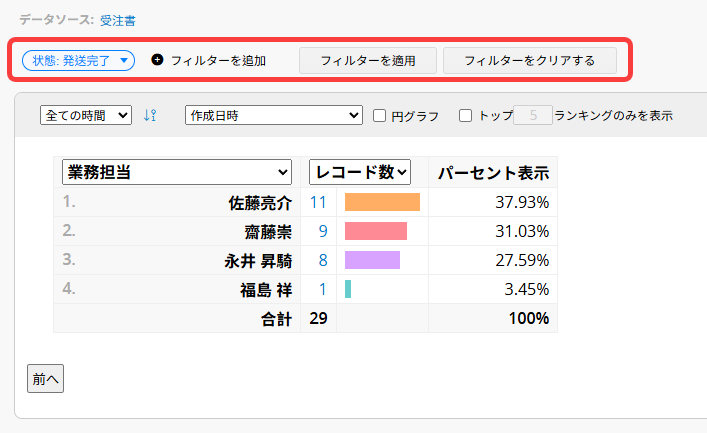 フィルター条件を追加したら、「フィルタを適用」をクリックして、絞り込み後のレポートを表示します。複数のフィールドを条件として追加することもできます。