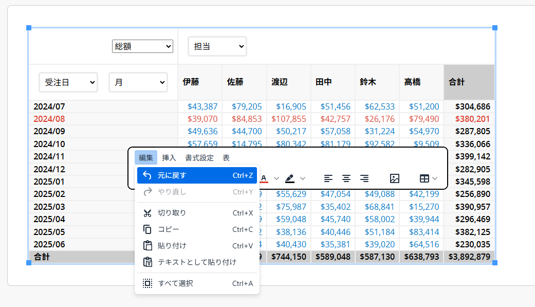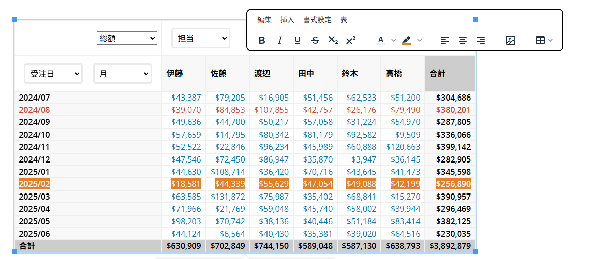 アイコンをクリックすると、新しいウィンドウが開きます。このウィンドウでは、レポート外の白いエリアをクリックするとツールバーが表示され、テキスト/画像/表の挿入や、レポートの書式調整が行えます。たとえば、値を太字や下線にしたり、文字色を変更したりできます。(折れ線グラフ、棒グラフ、円グラフ、二軸グラフのビジュアルに表示される値は調整できません。)表形式のレポートでは、列の追加/削除、表スタイルの変更、説明文の追加も可能です。