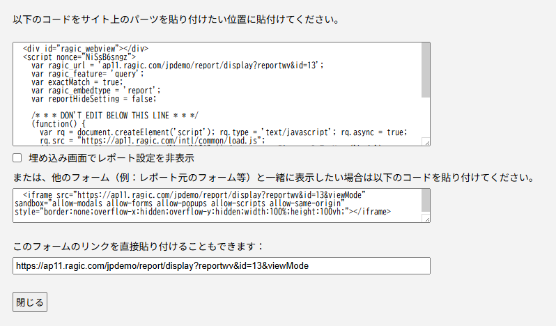 レポートをWeb サイトに埋め込むことや、リンクを共有することができます。